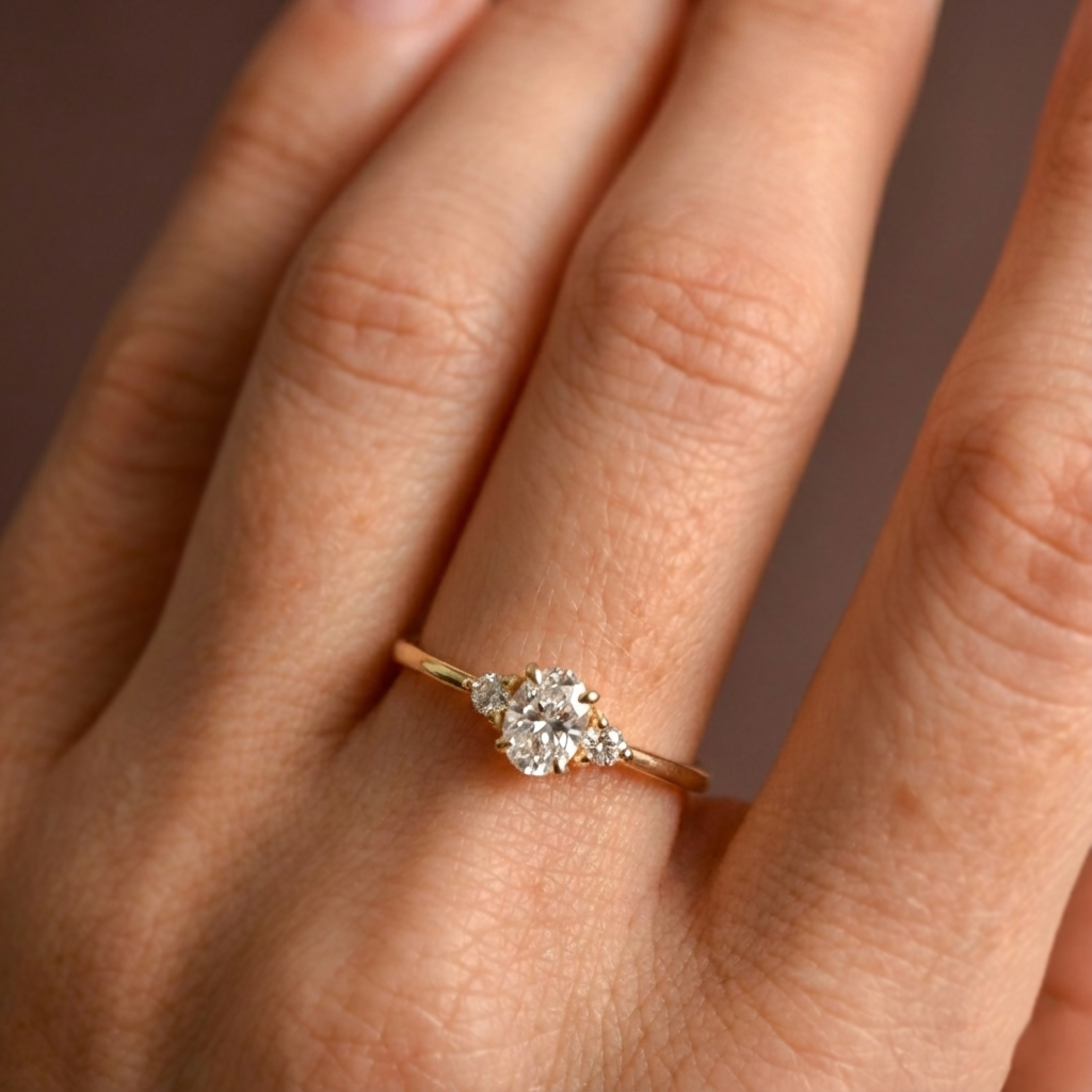 FLORA złoty pierścionek z trzema diamentami laboratoryjnymi, owal
